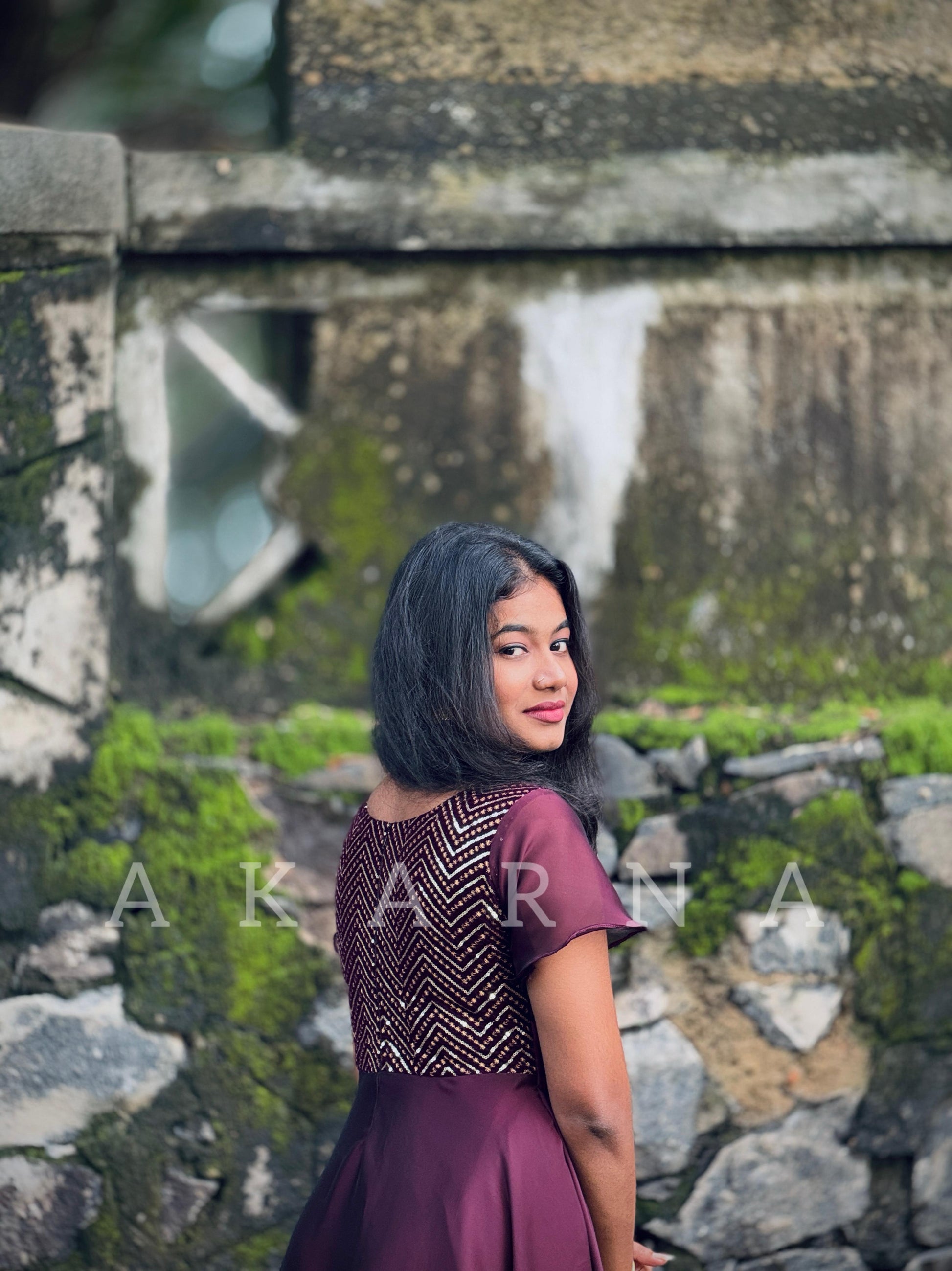 Gown : A stunning dark purple gown that blends elegance and mystery. Crafted from satin or velvet, it features a flattering silhouette with a flowing skirt and subtle shimmer. The refined neckline and delicate embellishments add a regal touch, perfect for gracefully commanding attention.