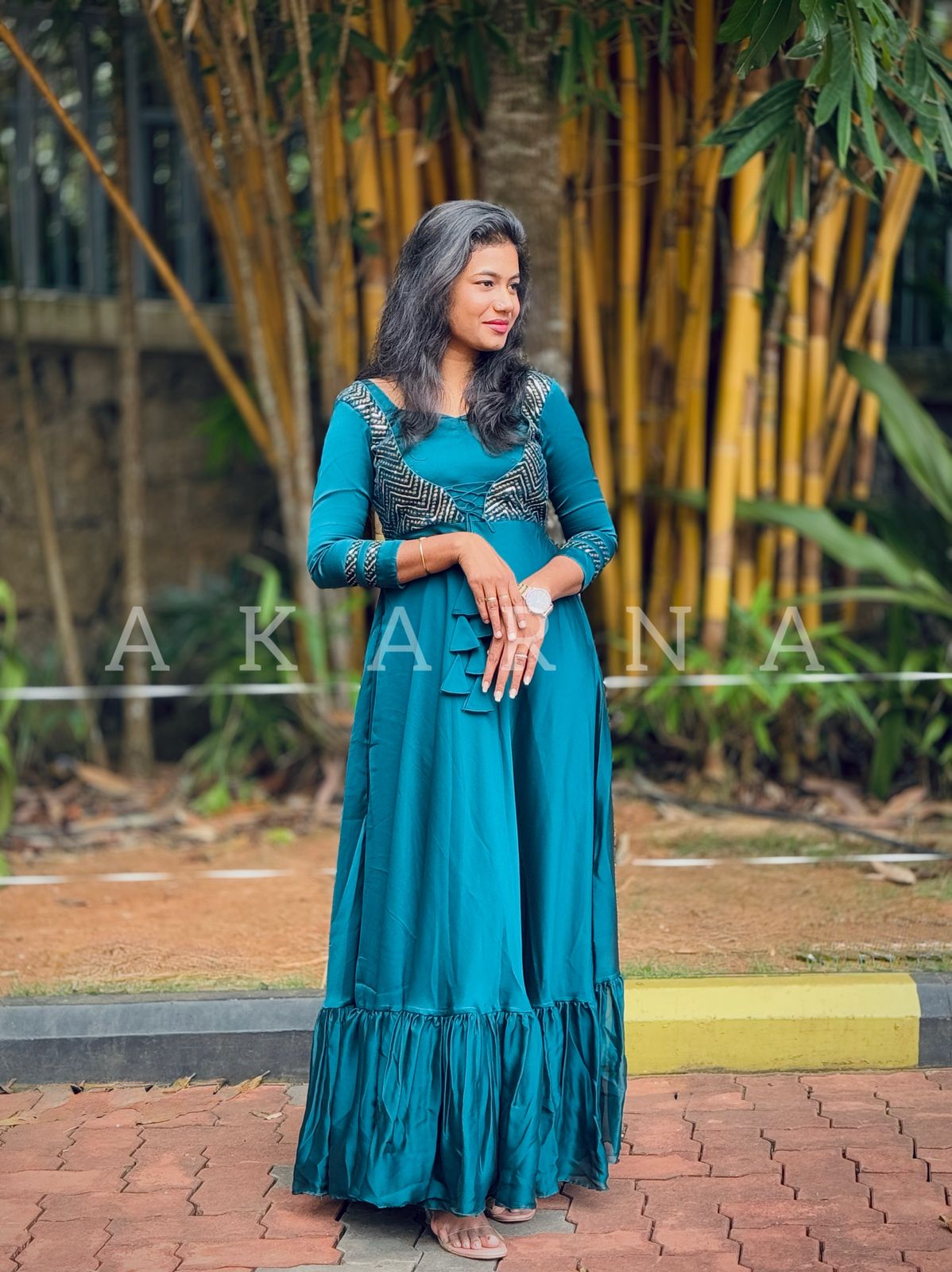 Crafted from luxurious satin, this gown features a rich teal hue that exudes elegance. The smooth, glossy finish drapes beautifully, offering a graceful silhouette perfect for evening events or special occasions: minimal effort, maximum impact.